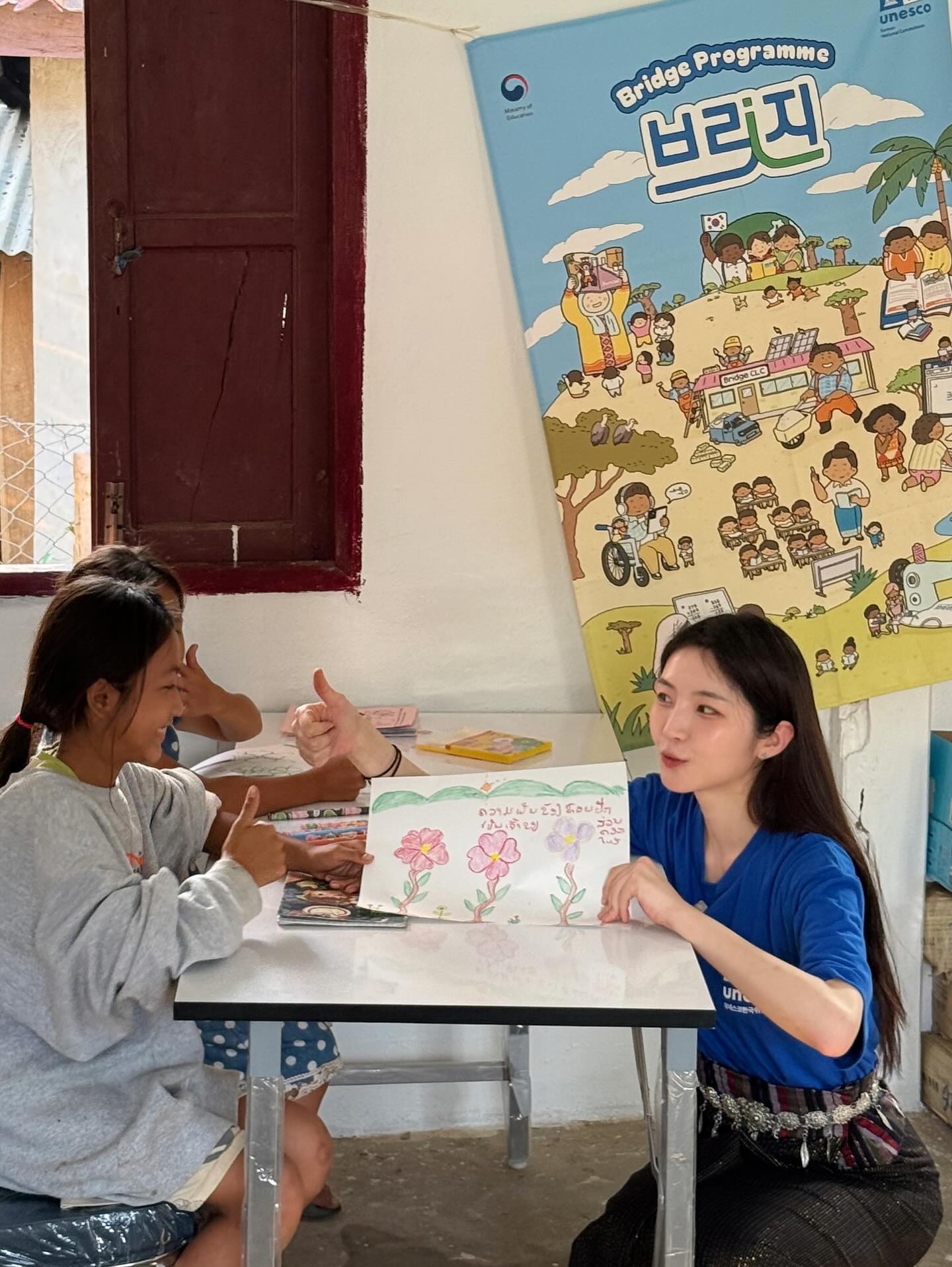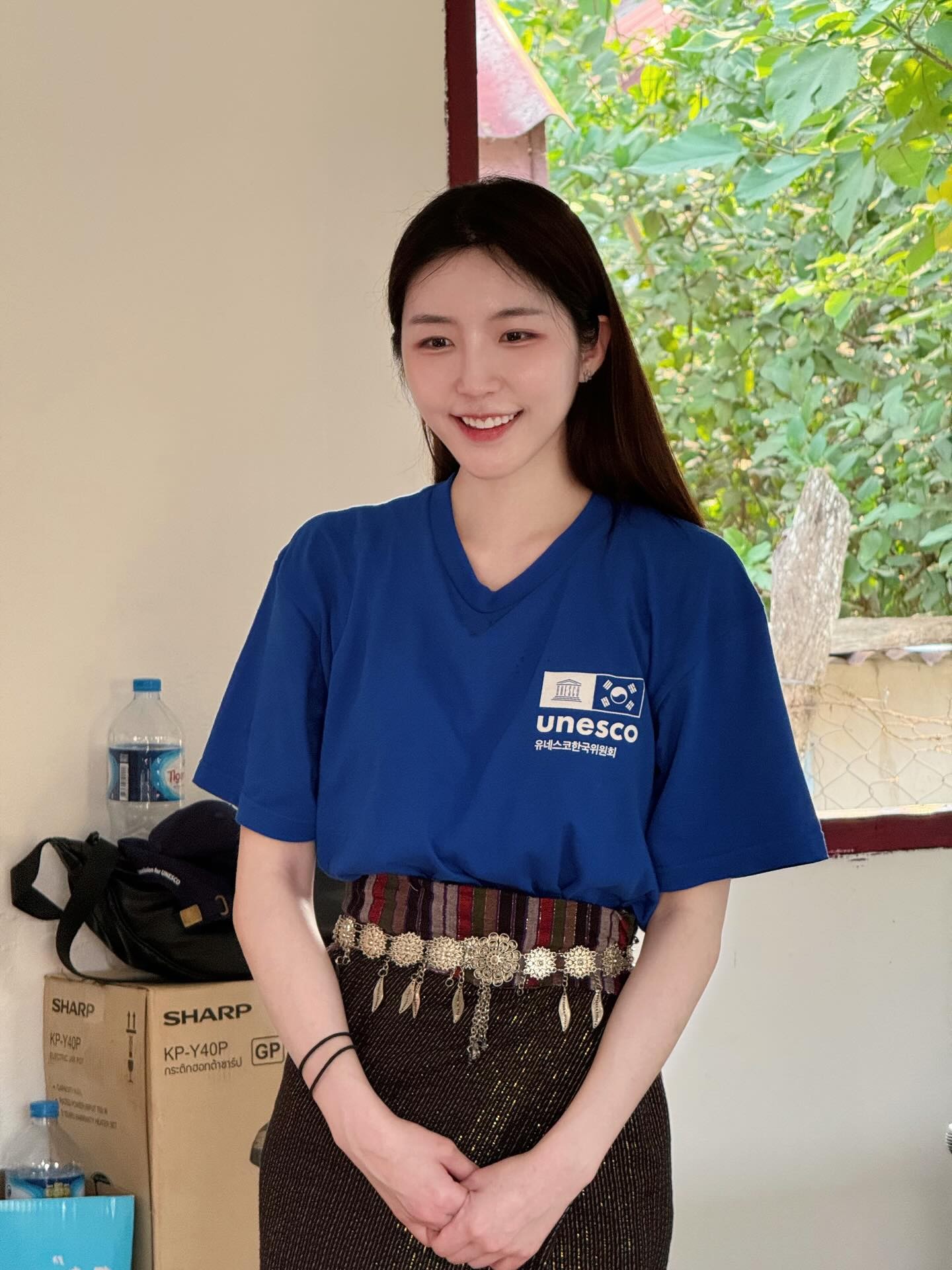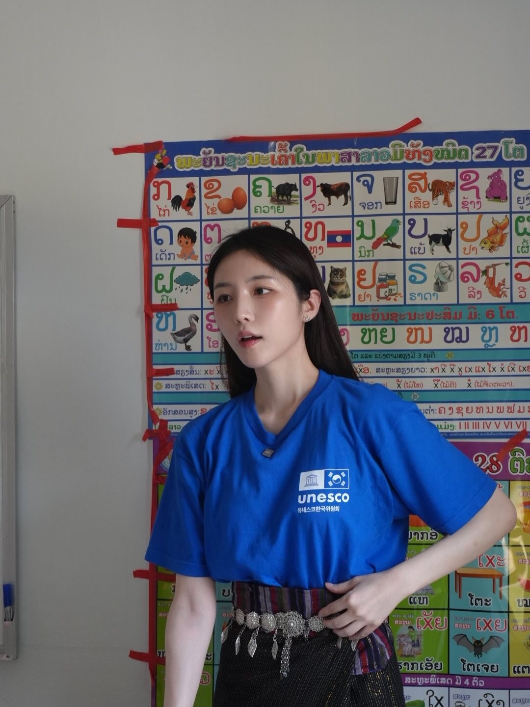 사진 속 성해은은 유네스코 한국위원회 티셔츠를 입고 라오스 아이들과 즐거운 시간을 보내고 있다.
