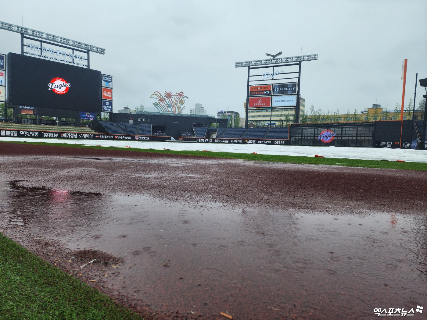 한화와 LG는 1일 대전한화생명볼파크에서 '2025 신한 SOL Bank KBO 리그' 정규시즌 여섯 번째 맞대결을 펼칠 예정이다. 현재 많은 양의 비가 그라운드를 적시고 있다. 대전, 박정현 기자