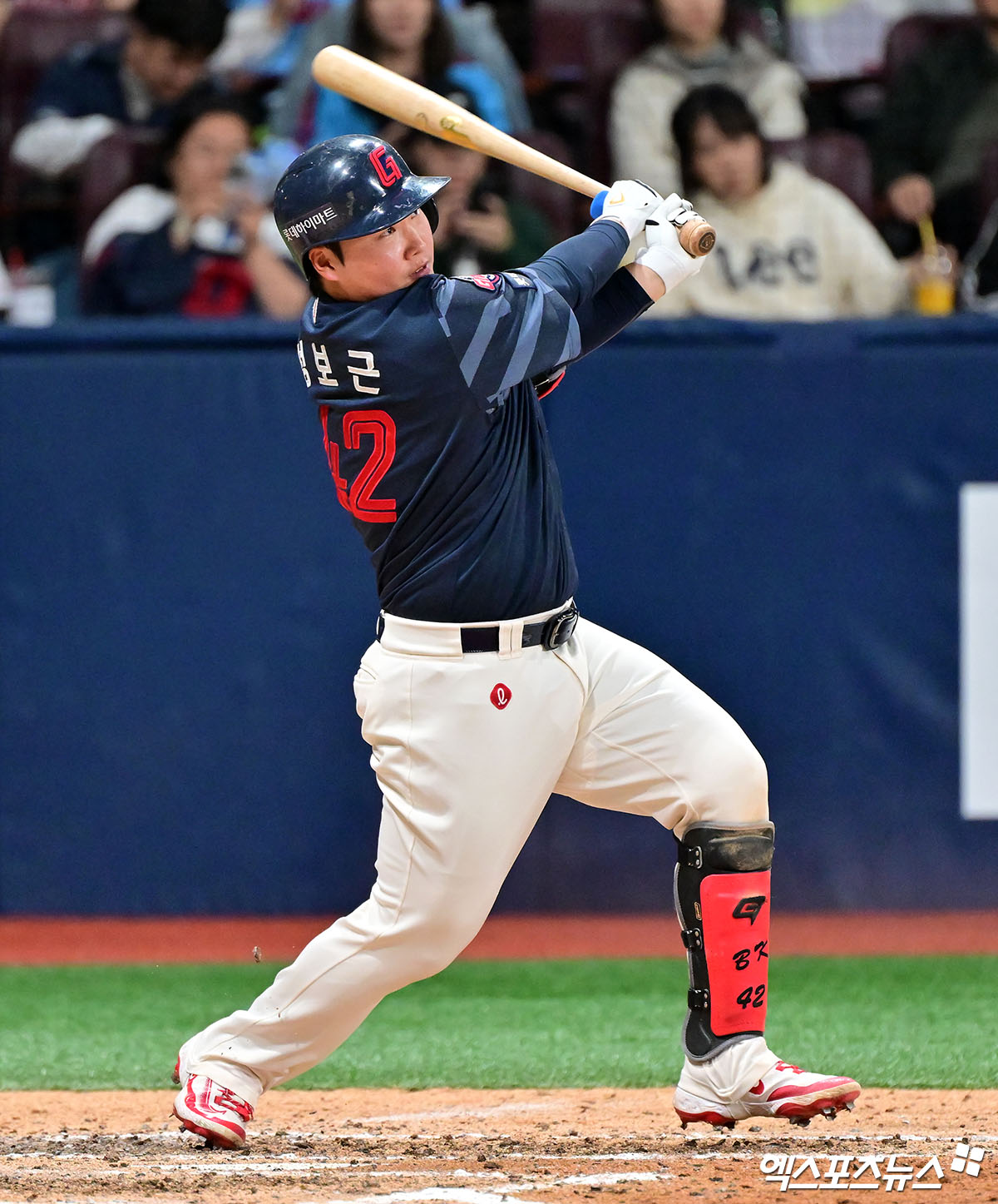 (엑스포츠뉴스 고척, 김한준 기자) 1일 오후 서울 구로구 고척스카이돔에서 열린 '2025 신한 SOL Bank KBO리그' 롯데 자이언츠와 키움 히어로즈의 경기, 6회초 2사 롯데 정보근이 타격을 하고 있다. 결과는 중견수 플라이 아웃.