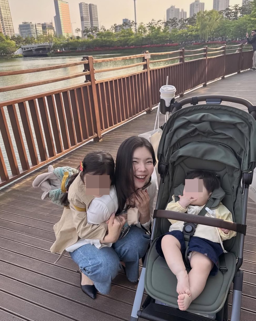 공개된 사진 속에는 가족 나들이 중인 이다은의 모습. 이다은은 환한 미소를 지으며 카메라를 응시하고 있고, 딸은 엄마의 등 뒤에 매달려 사랑스럽게 안고 있다. 유모차에는 아들이 누워 있어 세 가족의 다정한 분위기가 훈훈함을 자아낸다.