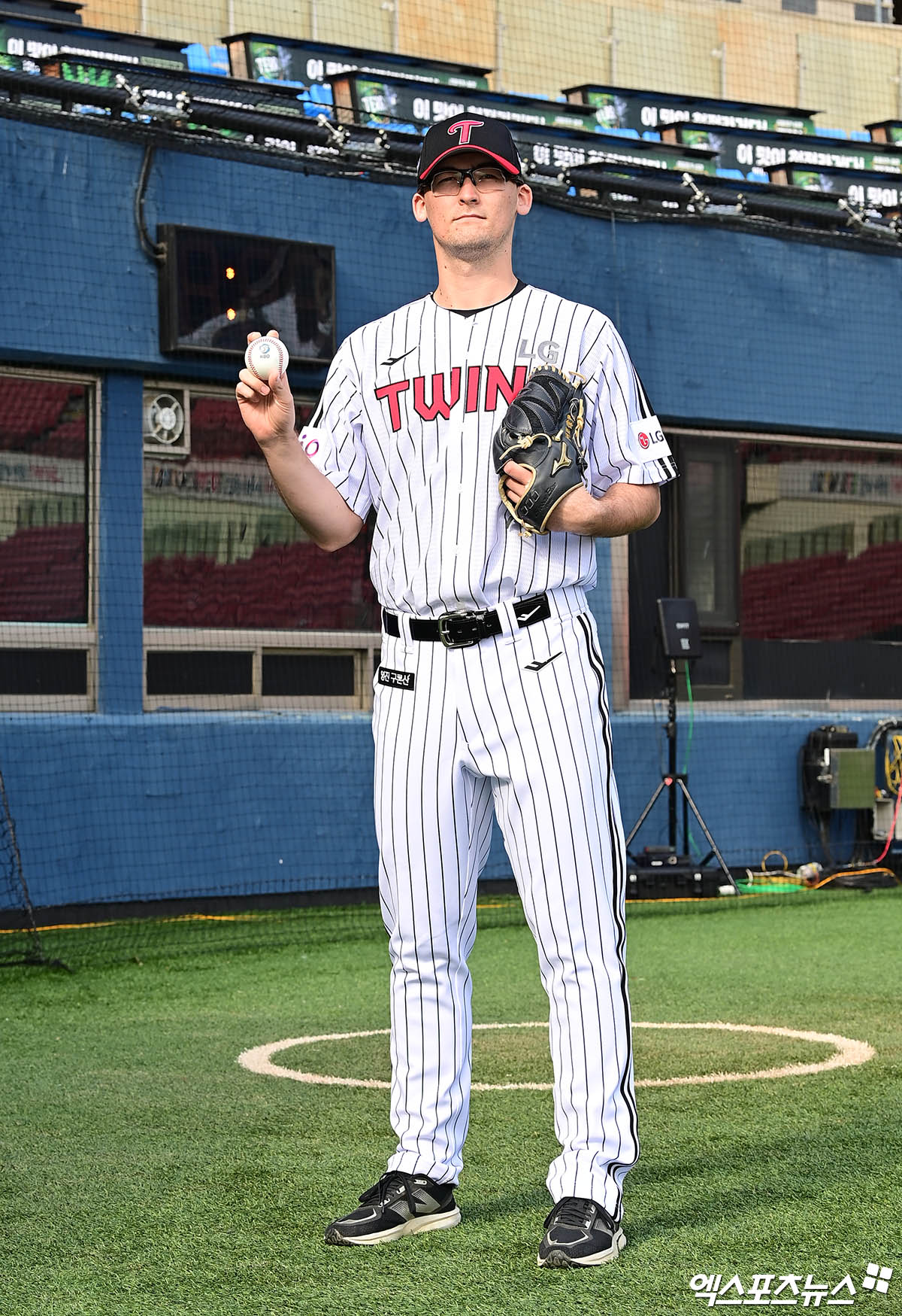 (엑스포츠뉴스 잠실, 박지영 기자) 2일 오후 서울 잠실야구장에서 열리는 '2025 신한 SOL Bank KBO리그' SSG 랜더스와 LG 트윈스의 경기에 앞서 LG 일시 대체 외국인 투수 코엔 윈이 그라운드에서 포즈를 취하고 있다.