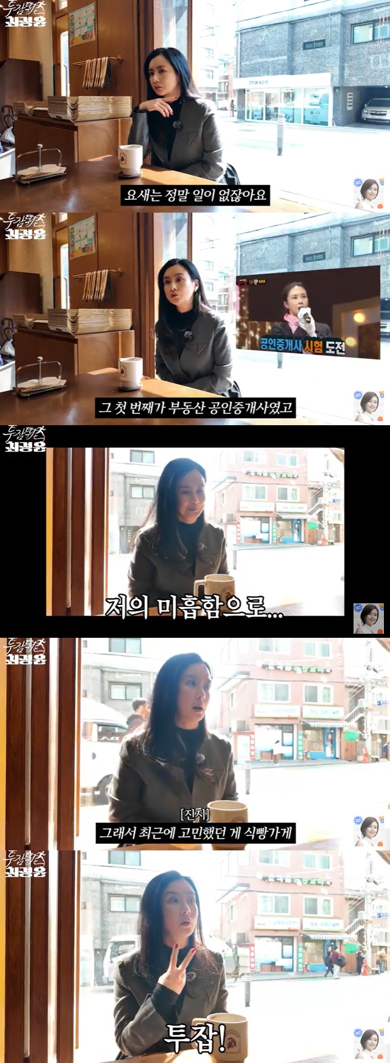 이어 최정윤은 "그래서 또 생각했던 게 식빵 집이다. 아이를 키워야 되니까 집에서 가까운 곳, 내 시간에 구애받지 않을 수 있는 몇 가지 제한점이 있더라"며 식빵 전문 베이커리 운영을 진지하게 고민했다고 말했다.