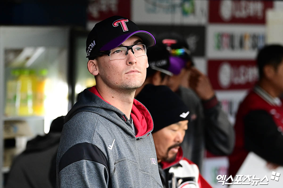 (엑스포츠뉴스 잠실, 박지영 기자) 2일 오후 서울 잠실야구장에서 열린 '2025 신한 SOL Bank KBO리그' SSG 랜더스와 LG 트윈스의 경기, LG 코엔 윈이 더그아웃서 경기를 지켜보고 있다.