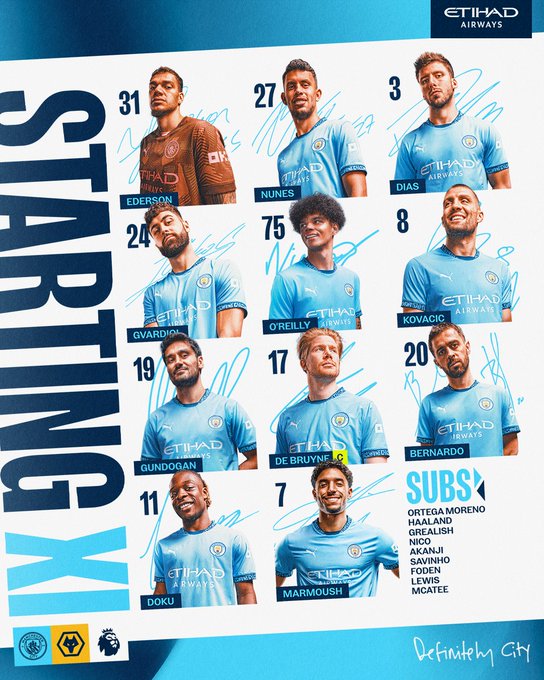 펩 과르디올라 감독이 이끄는 맨시티는 4-2-3-1 포메이션을 꺼냈다. 에데르송이 골키퍼 장갑을 꼈고, 니코 오라일리, 요슈코 그바르디올, 후벵 디아스, 마테우스 누네스가 수비라인을 구성했다. 3선에서 마테오 코바치치와 일카이 귄도안이 호흡을 맞췄고, 2선에는 제레미 도쿠, 케빈 더 브라위너, 베르나르두 실바가 포진했다. 최전방 원톱에는 오마르 마르무시가 선발 출전했다.