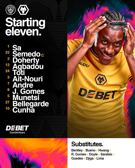울버햄프턴의 비토르 페레이라 감독은 이날 3-4-2-1 포메이션을 선택했다. 조제 사가 골문을 지켰고, 토티 고메스, 에마뉘엘 아그바두, 맷 도허티가 백3를 구축했다. 윙백으로 라얀 아이트 누리와 넬송 세메두가 나섰고, 중원은 안드레와 주앙 고메스가 책임졌다. 2선 공격에는 장 리크너 벨레가르드와 마셜 무네치, 최전방 원톱에는 마테우스 쿠냐가 나섰다. 황희찬은 벤치에서 대기했다.