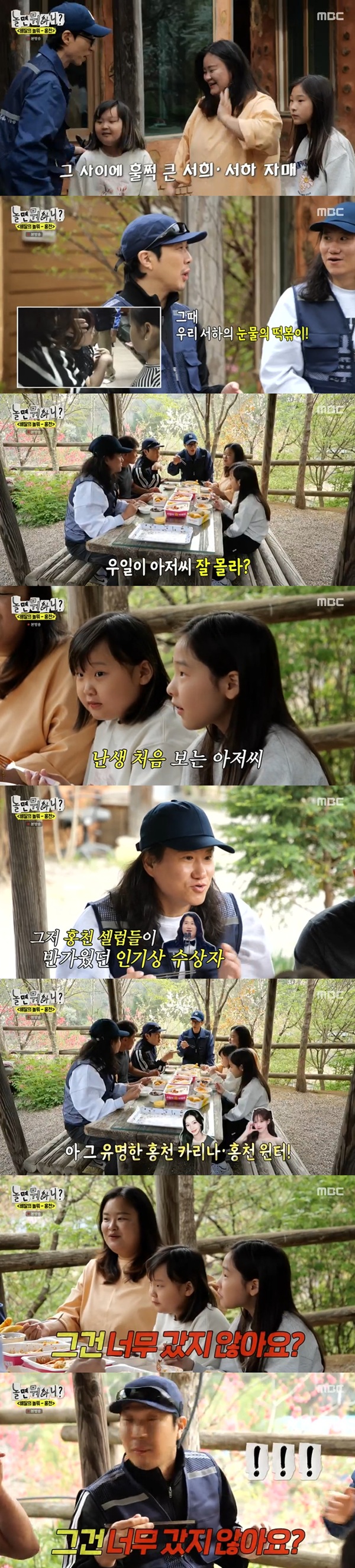 '놀뭐'로 유명해진 자매의 근황을 전한 엄마에 하하는 "얘네가 그 유명한 홍천 카리나, 홍천 윈터 아니냐"고 이야기했다.