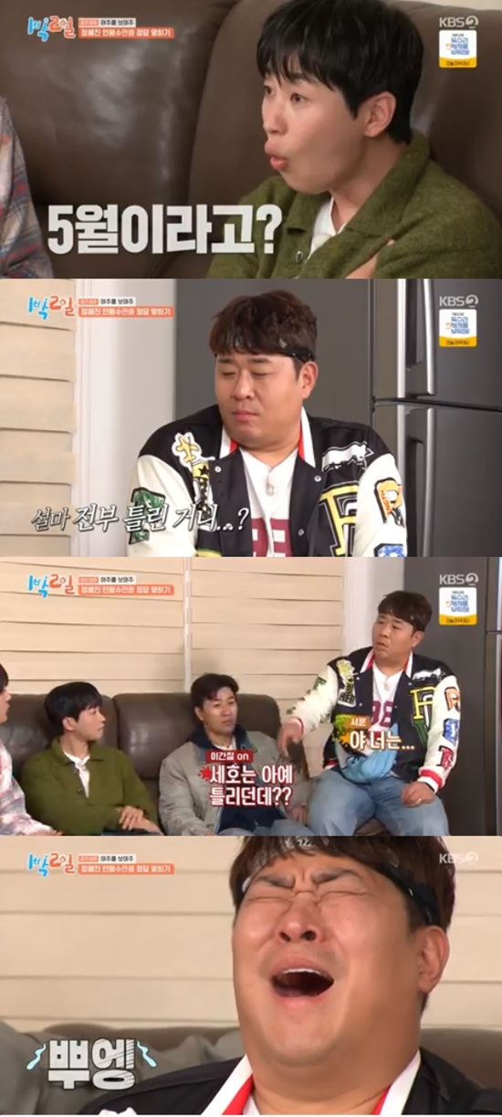 딘딘과 조세호는 10월, 김종민은 11월, 유선호는 7월이라고 말했다. 다섯 번째 순서로 등장한 문세윤은 자신의 생일은 5월이라고 얘기했다.