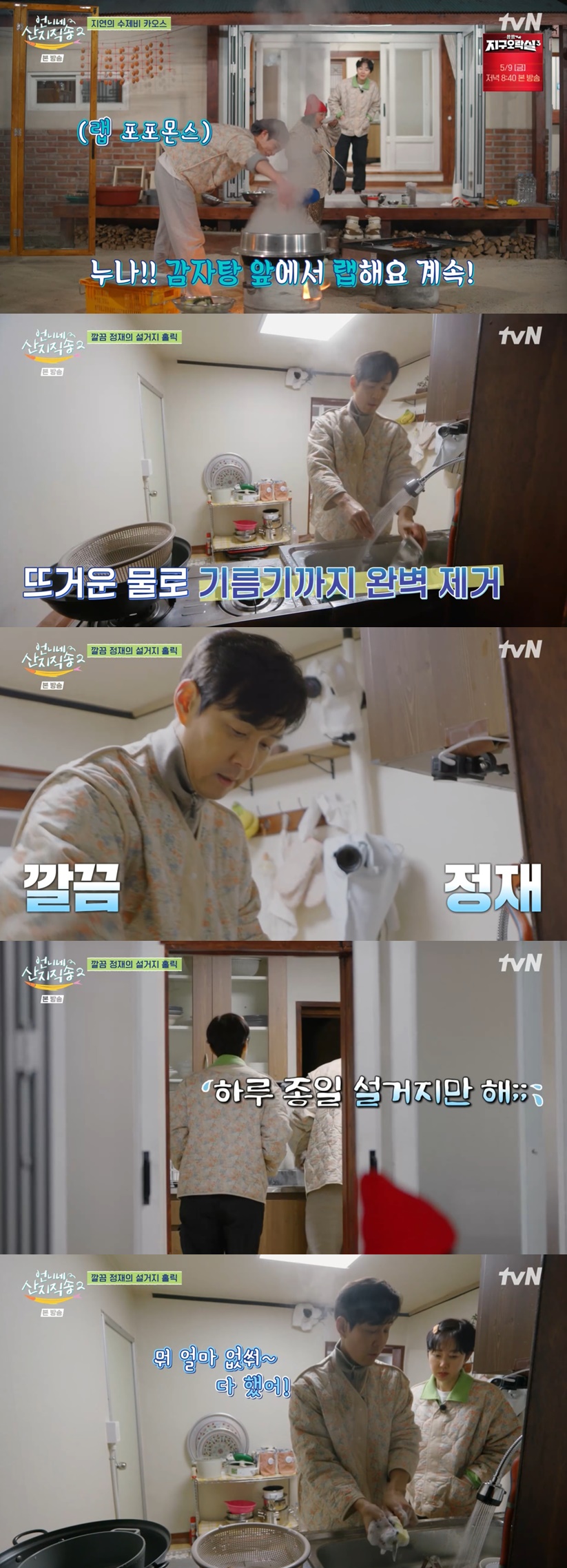 임지연이 수제비 반죽으로 분주한 사이, 이정재는 묵묵히 싱크대 앞에서 설거지를 도맡으며 든든한 지원군 역할을 톡톡히 해냈다. 염정아는 이정재에게 "뭘 또 설거지를 하고 있냐. 하루 종일 설거지만 하냐"고 깜짝 놀랐고, 이정재는 "다 했다. 얼마 없다"고 말했다.