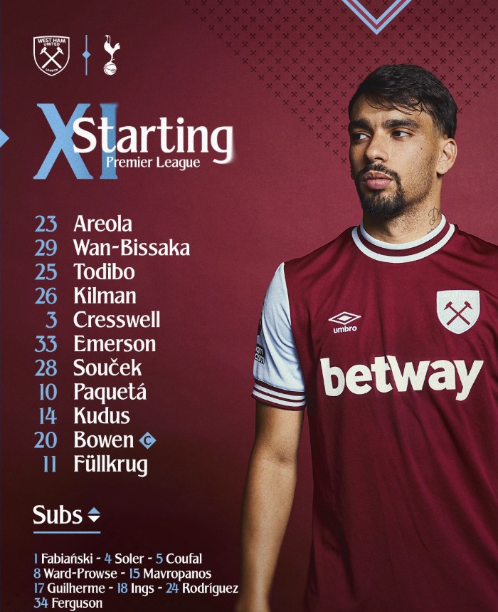 홈팀 웨스트햄은 3-4-2-1 전략을 준비했다. 알폰소 아레올라가 골문을 지킨다. 에런 크레스웰, 맥스 킬먼, 장클레어 토디보가 수비진을 구성한다. 에메르송, 루카스 파케타, 토마스 수첵, 에런 완-비사카가 중원을 맡는다. 그 앞에 모하메드 쿠두스, 재로드 보웬이 위치하며 니콜라스 퓔크루크가 원톱 출격한다.