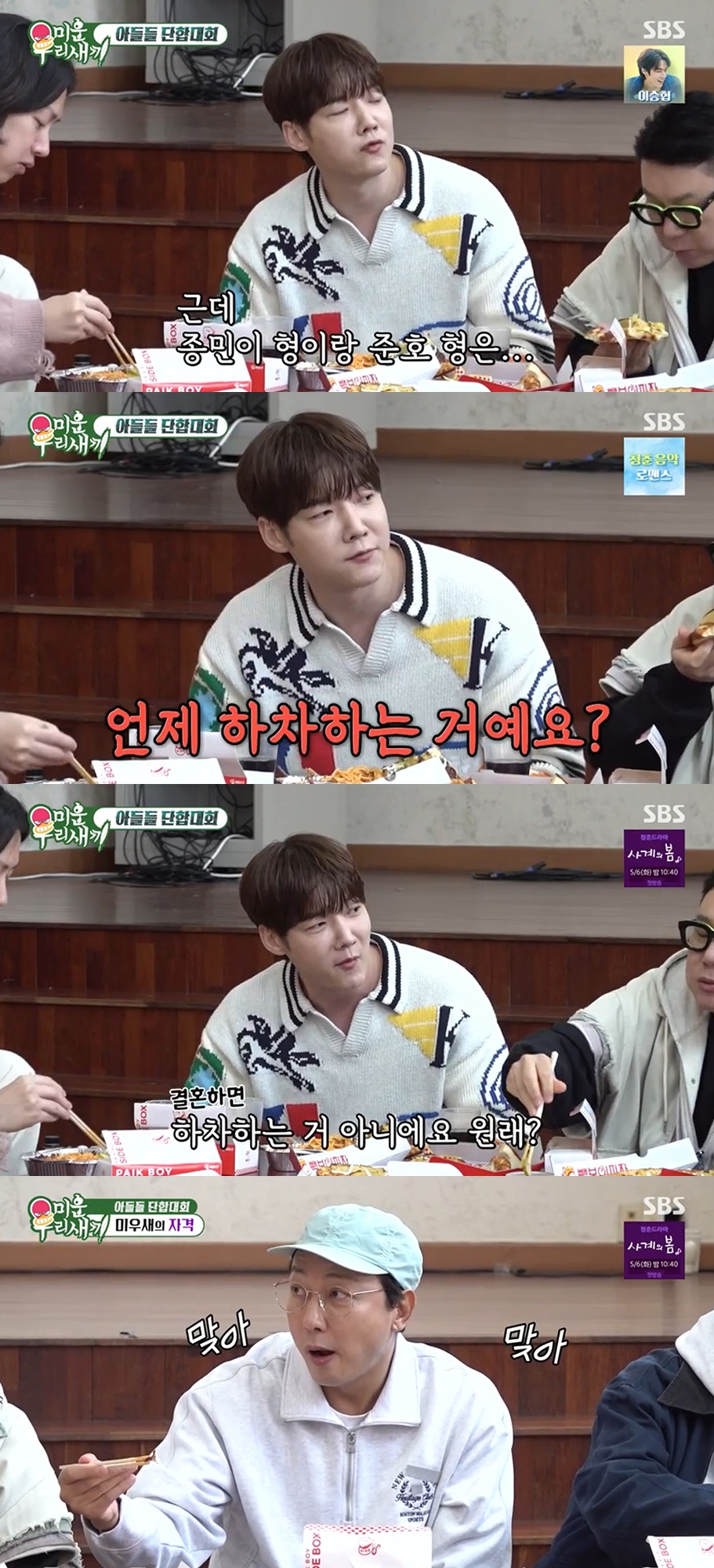 이날 단합을 위해 모인 아들들을 새신랑 김준호, 김종민의 결혼 이야기로 포문을 열었다. 최진혁은 "종민이 형이랑 준호 형은 언제 하차하는 거냐"고 돌직구를 날렸고, 김종민은 "체하게 왜그래?"라며 당황했다.