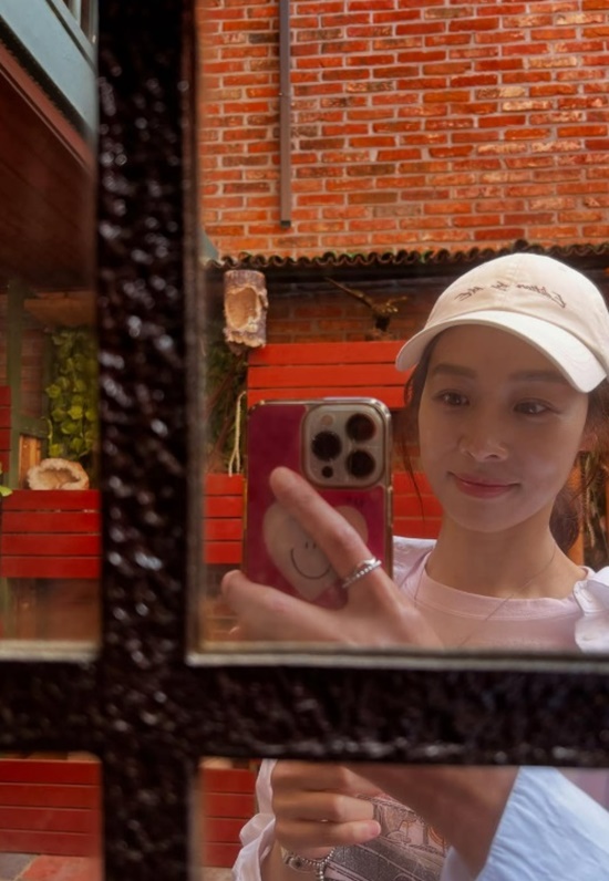 공개된 사진 속 장신영은 거울 앞에서 휴대전화로 셀카를 촬영하며 미소짓고 있다.