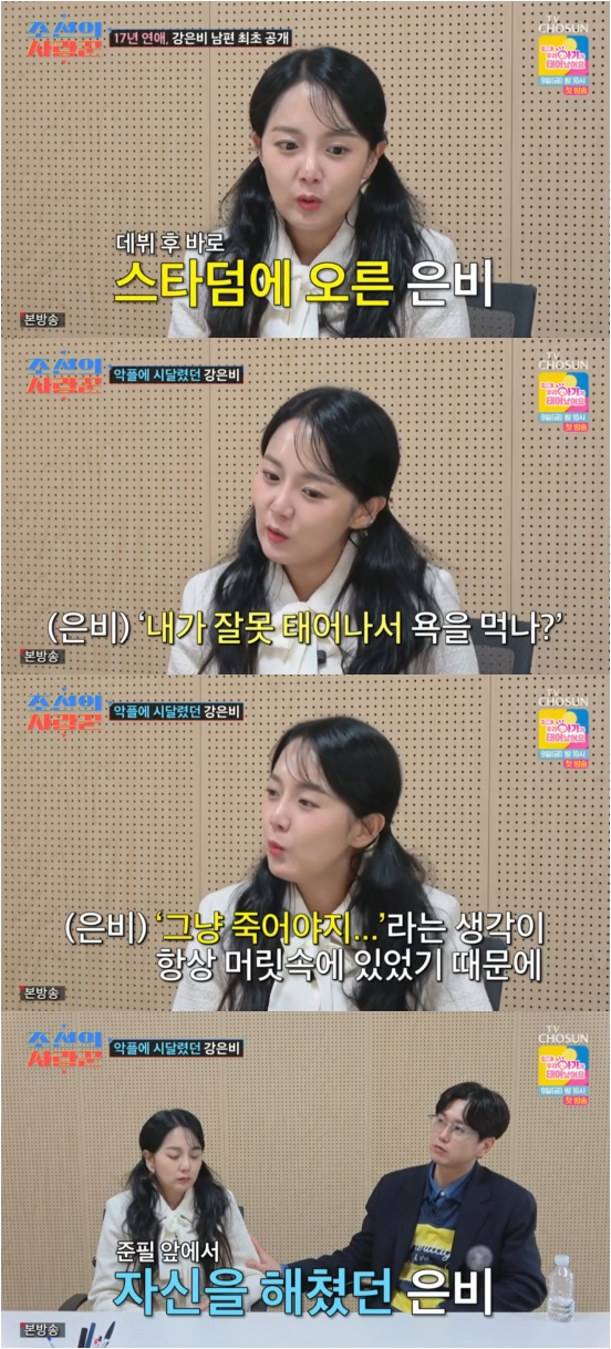 강은비는 "뭐라고 말하기가 좀 어려웠던 게 엄청 나쁜 행동을 많이 했다. '그냥 죽어야지, 뭐' 이게 항상 머릿속에 있었기 때문에. '(내가 죽으면) 항상 그런 문제 있고 비호감인 사람이 아니라 그냥 날 봐줄까?' 저를 지우고 싶었다"라며 고백했다.