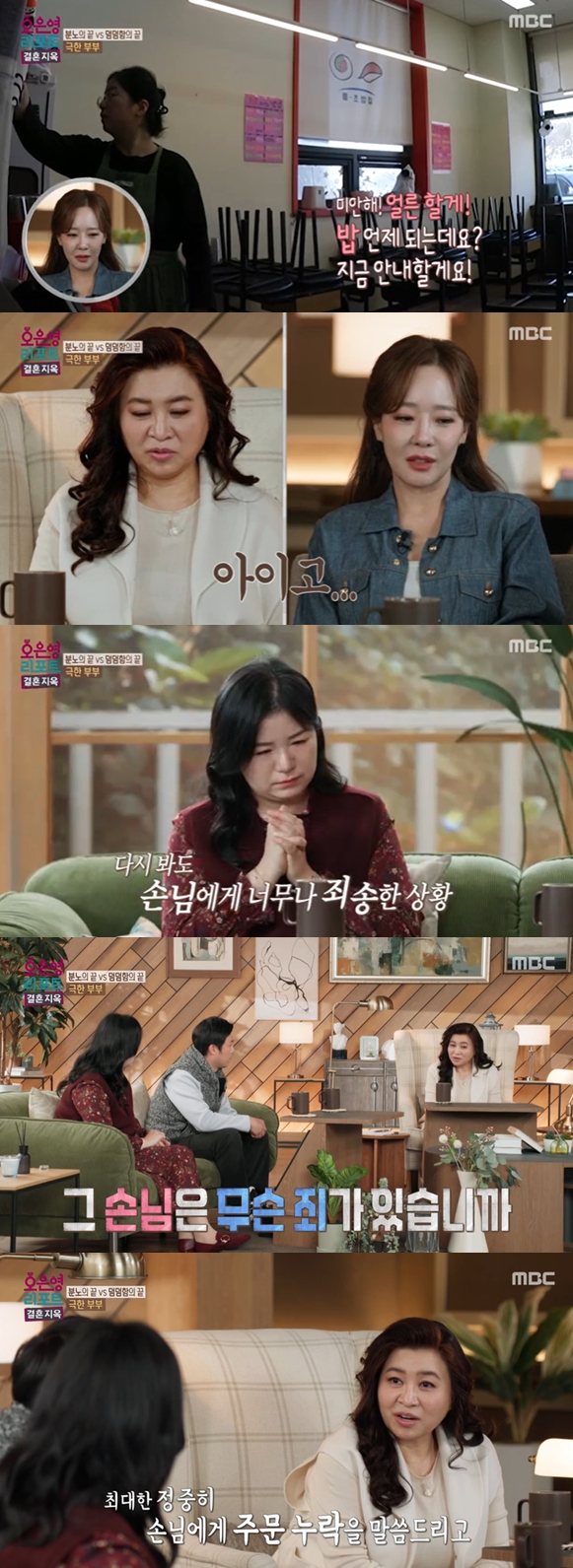 오은영은 "일단 손님한테 먼저 가서 주문 누락을 말씀드리고 해결해야 하는데 이 상황에서도 두 사람의 갈등이 깊다 보니까. 사실 제가 손님이라면 아무리 음식이 맛있어도 안 가고 싶을 것 같다"라고 말했다.