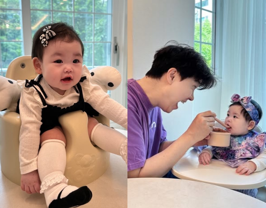 특히 재이의 이유식을 먹이고 있는 박수홍이 딸과 보라색으로 '깔 맞춤' 패션을 선보여 눈길을 끌었다.