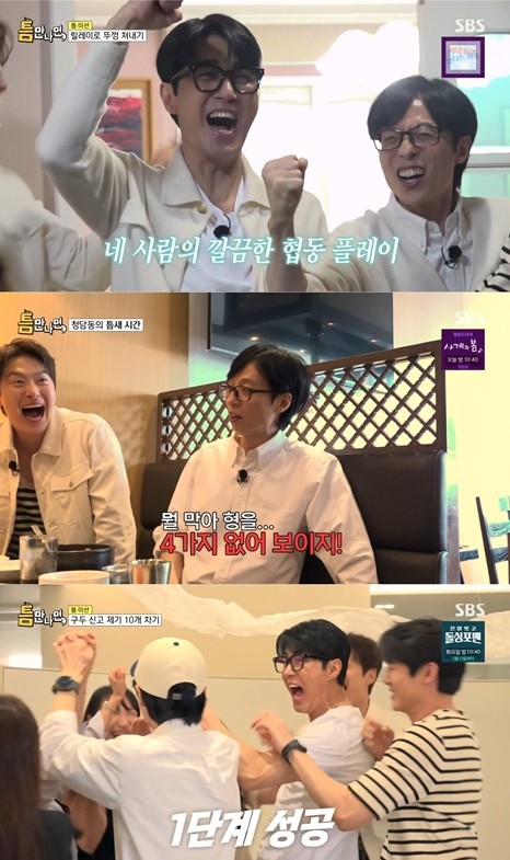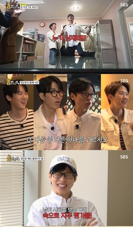 지난 6일(화) 방송된 SBS '틈만 나면,'은 돌아온 2MC 유재석, 유연석과 함께 '틈 친구(게스트)' 차승원, 공명이 출격해 잡지사와 웨딩 컨설턴트사의 틈새 시간을 왁자지껄한 웃음 대침투 케미로 사로잡았다.