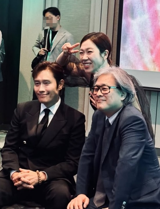 박찬욱 감독의 인자한 미소와 브이(V) 포즈로 밝은 에너지를 전하는 염혜란 옆 푸근한 분위기를 풍기는 이병헌의 모습이 시선을 사로잡는다.