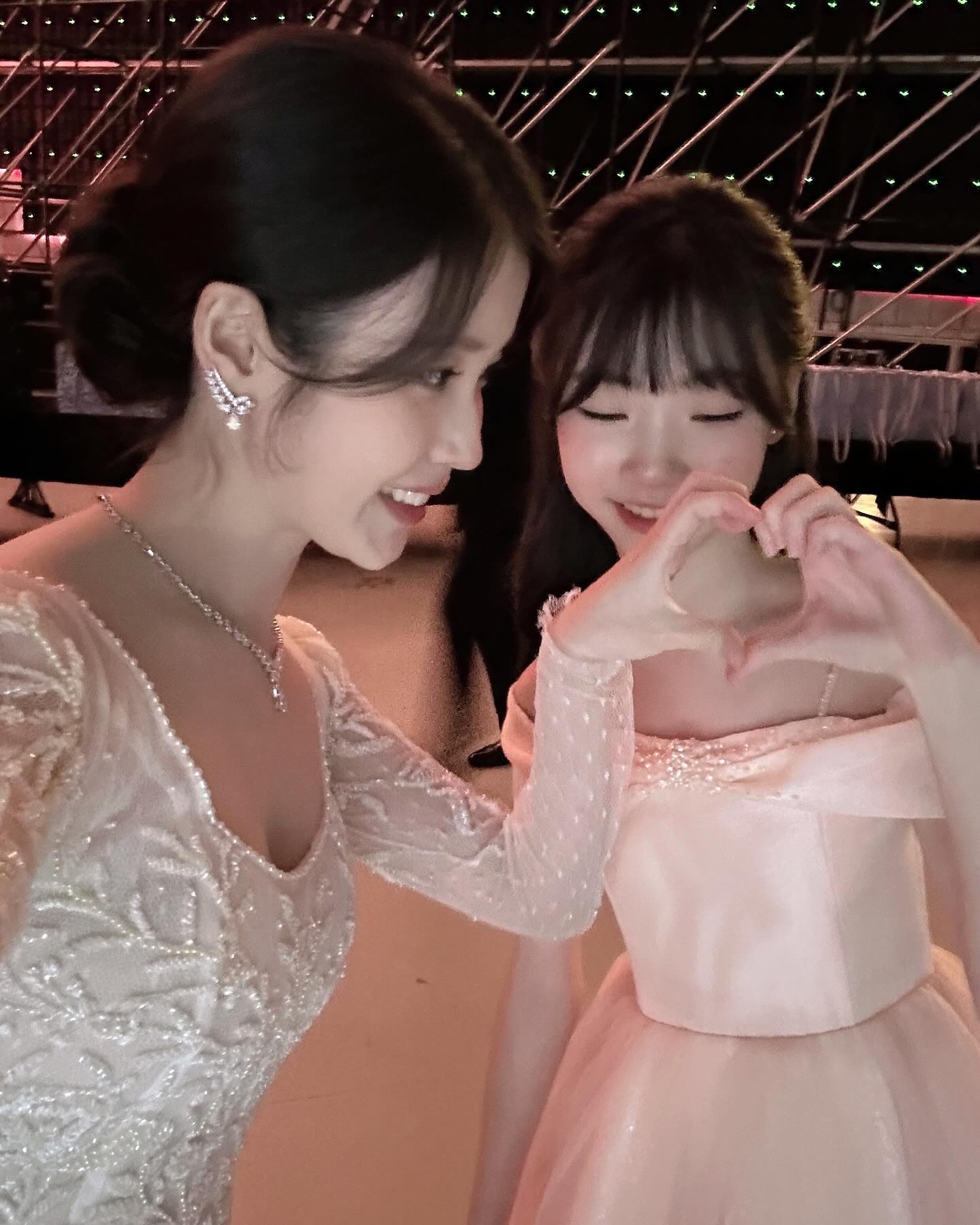 사진 속에는 순백의 드레스를 입고 카메라를 응시하는 아이유의 모습들이 담겨 있다. 무대 아래에서는 애순 아역을 맡은 김태연과 손으로 하트를 만들고 있어 훈훈함을 자아낸다.