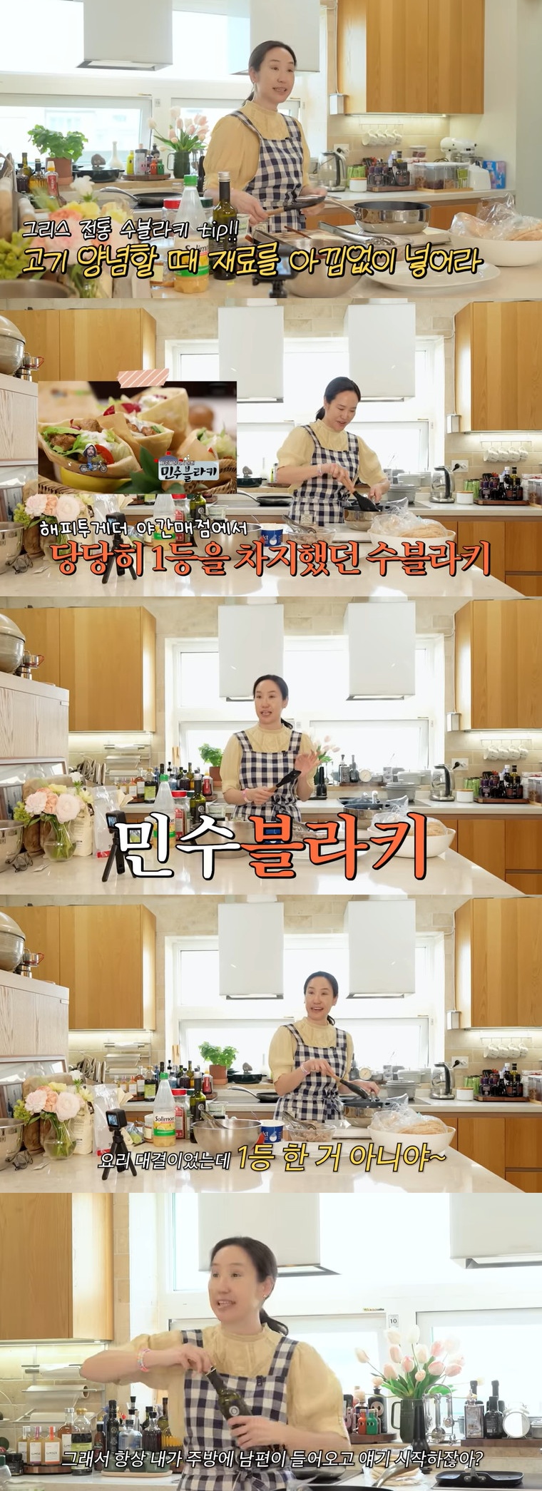 강주은은 "그때는 남편 이름으로 만들었다. '민수블라키'라고 불렀다. 요리 대결이었는데 1등 했다"며 남편 최민수의 이름을 딴 요리로 1등을 차지했음을 전했다.
