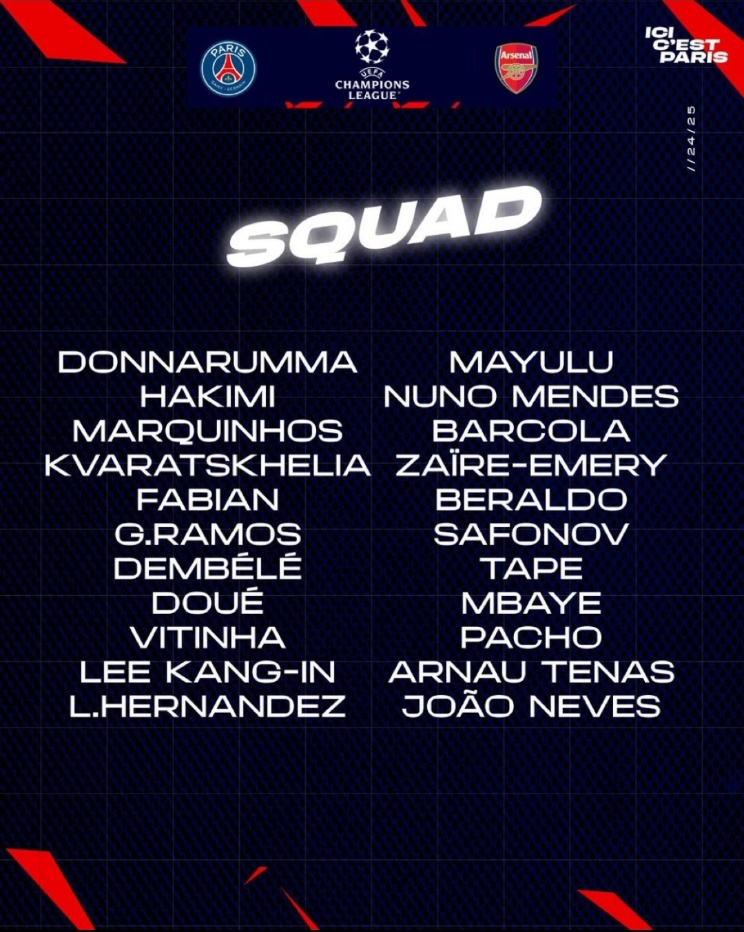 그런 상황이서 이강인도 일단 아스널과의 홈 경기에 나설 수 있는 명단에 등록됐다. PSG는 7일 오후 22명의 아스널전 스쿼드를 발표했는데 이강인이 이름을 올렸다.