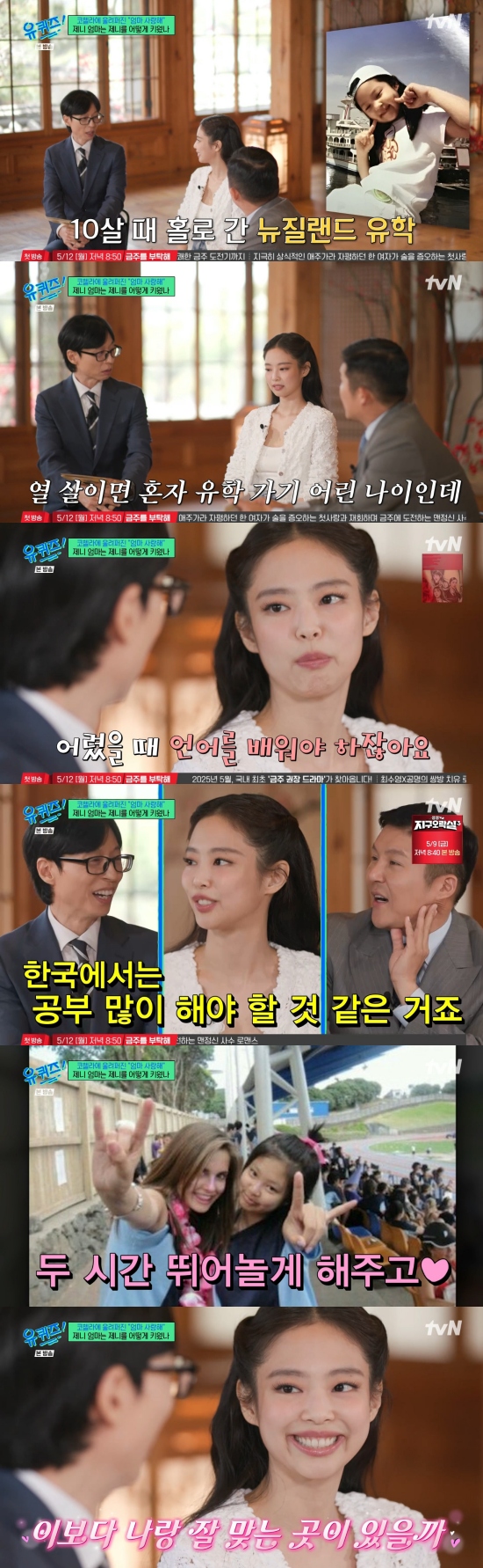 또 유재석은 "10살 때 홀로 뉴질랜드 유학을 갔다. 그냥 보내셨냐"라며 물었고, 제니는 "성인이 되고 나서 이 대화를 많이 했는데 엄마는 그냥 더 넓은 세상에서 자라게 하고 싶었던 마음이셨던 거 같다"라며 못박았다.