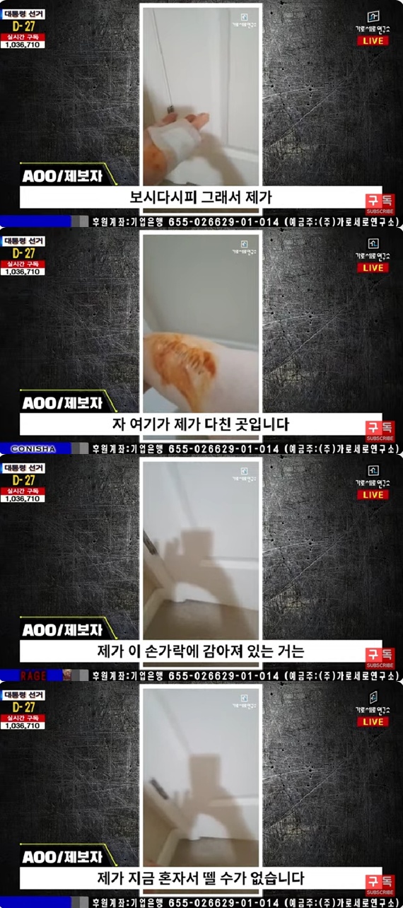 이어진 영상에서 제보자 A씨는 "왼손은 손을 쓸 수 없다. 오른쪽 어깨 쪽을 찍으려고 하면 손이 좀 떨린다. 이해해 주시고 사진을 찍어서 보내려고 했지만 개소리할까봐 아주 감사하다. 여기가 내가 다친 곳이다. 그리고 여기 왼손은 지금 신경 문제로 손가락에 감아져 있는 건 지금 혼자서 뗄 수 없다. 지혈이 안돼서 무슨 가루 같은 것도 넣고 이제 지혈이 좀 되고 있다"라고 말했다.