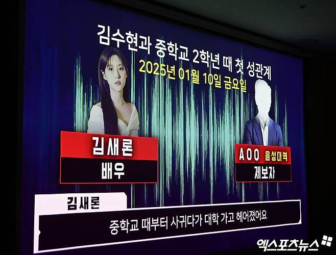 그 근거로 김새론의 10년 지인이라는 제보자 A씨가 김새론이 동의 하에 녹음했다는 1시간 30분가량의 녹취록 중 일부를 공개했다. 사망 한달 전 김새론은 "김수현과 중학교 2학년 때 사귀었다", "중 2 겨울방학 때 처음 성관계를 가졌다. 그것도 지금 생각하면 당했다고 해야 하나", "다른 아이돌과의 성관계 사진을 보여줬다" 등의 발언을 했다.