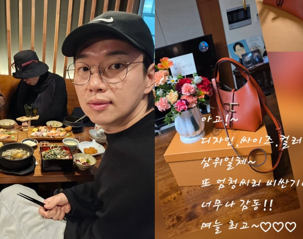 공개된 사진에는 화려한 꽃이 담긴 화병 옆에 고가의 명품 브랜드 가방이 있으며, "디자인, 사이즈, 컬러 삼위일체~ 또 엄청시리 비싼 거네. 너무나 감동!! 며늘 최고~♡"라는 장성규의 어머니가 작성한 듯한 다정한 글이 눈길을 끈다.