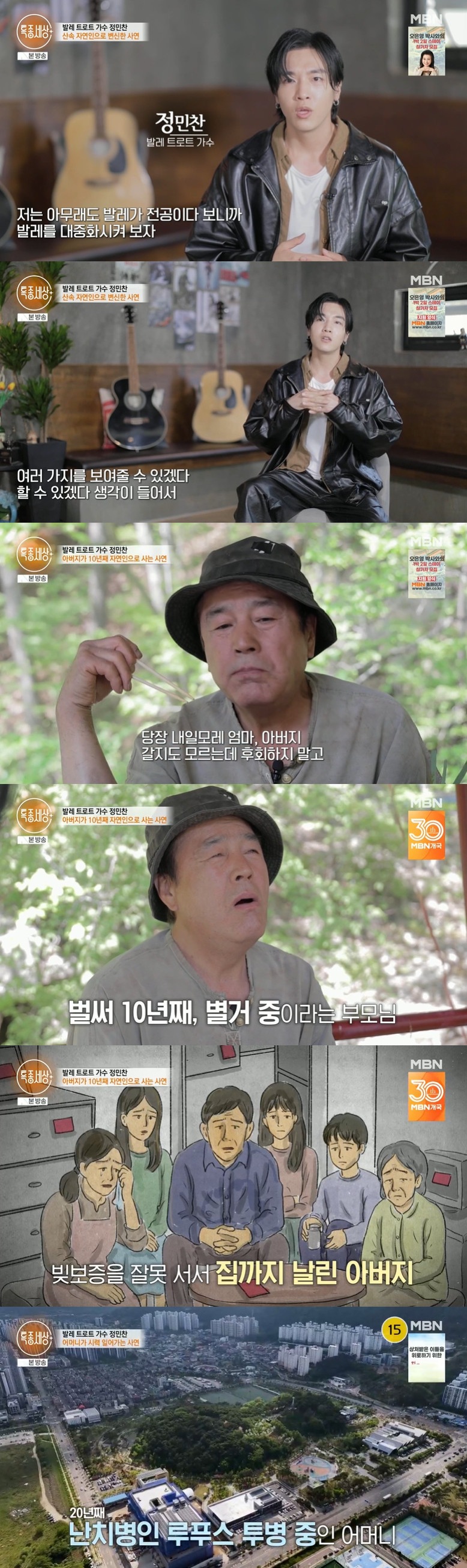 10년째 산속 생활을 하고 있는 아버지에 정민찬은 "안 힘드냐"고 물었고, 아버지는 "젊을 때 네 엄마한테 죄를 너무 많이 지어서 너희도 고생했다. 후회를 많이 한다. 잘못했던 것, 다른 가정처럼 오손도손 못 했던 게 미련이 남는다"고 고백했다.