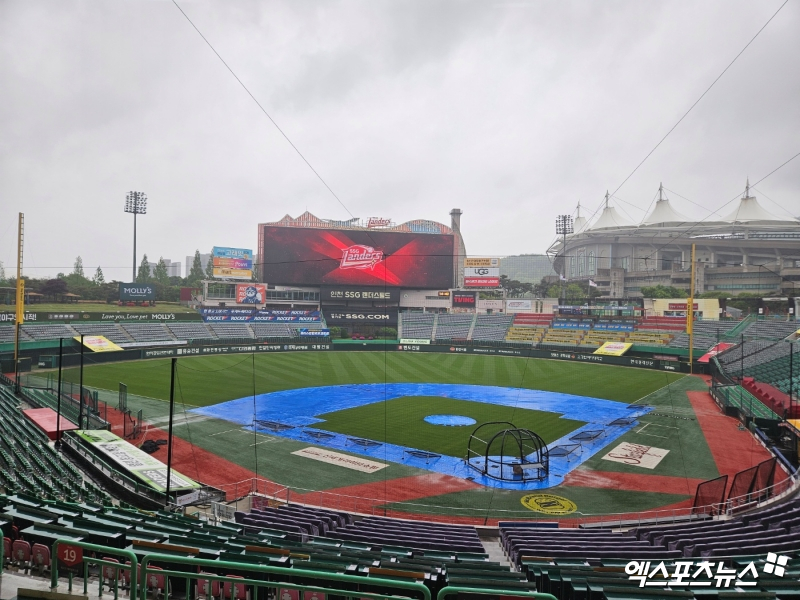 다만 변수가 하나 존재한다. 바로 날씨다. 오후 2시 55분 현재 인천SSG랜더스필드에 비가 내리는 중이다. 내야에는 방수포가 설치된 상태다. 홈팀 SSG 선수들은 실내 공간에 머무르고 있다.