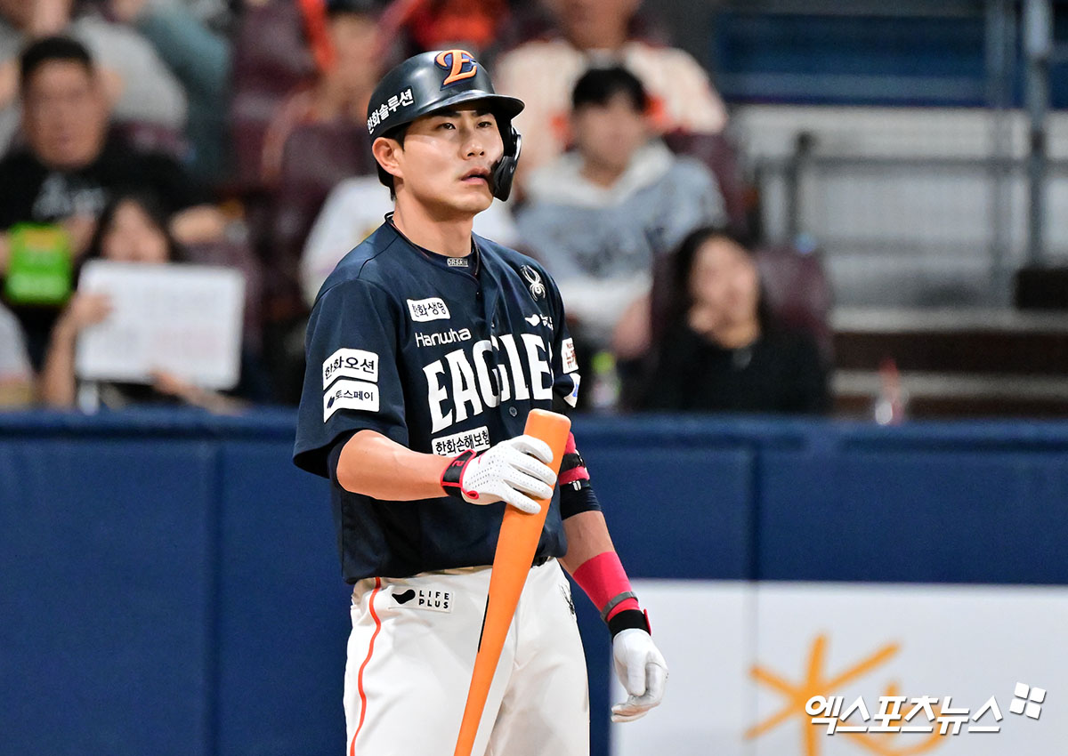 (엑스포츠뉴스 고척, 김한준 기자) 9일 오후 서울 구로구 고척스카이돔에서 열린 '2025 신한 SOL Bank KBO리그' 한화 이글스와 키움 히어로즈의 경기, 3회초 한화 심우준이 1루수 라인드라이브로 아웃된 후 아쉬워하고 있다.