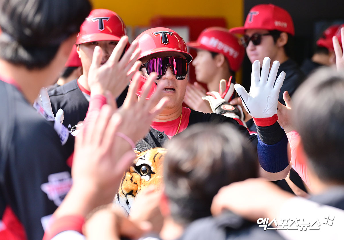 (엑스포츠뉴스 인천, 김한준 기자) 11일 오후 인천SSG랜더스필드에서 열린 '2025 신한 SOL Bank KBO리그' KIA 타이거즈와 SSG 랜더스의 경기, 5회초 1사 1루 KIA 최형우가 투런 홈런을 날린 후 더그아웃에서 하이파이브를 하고 있다.