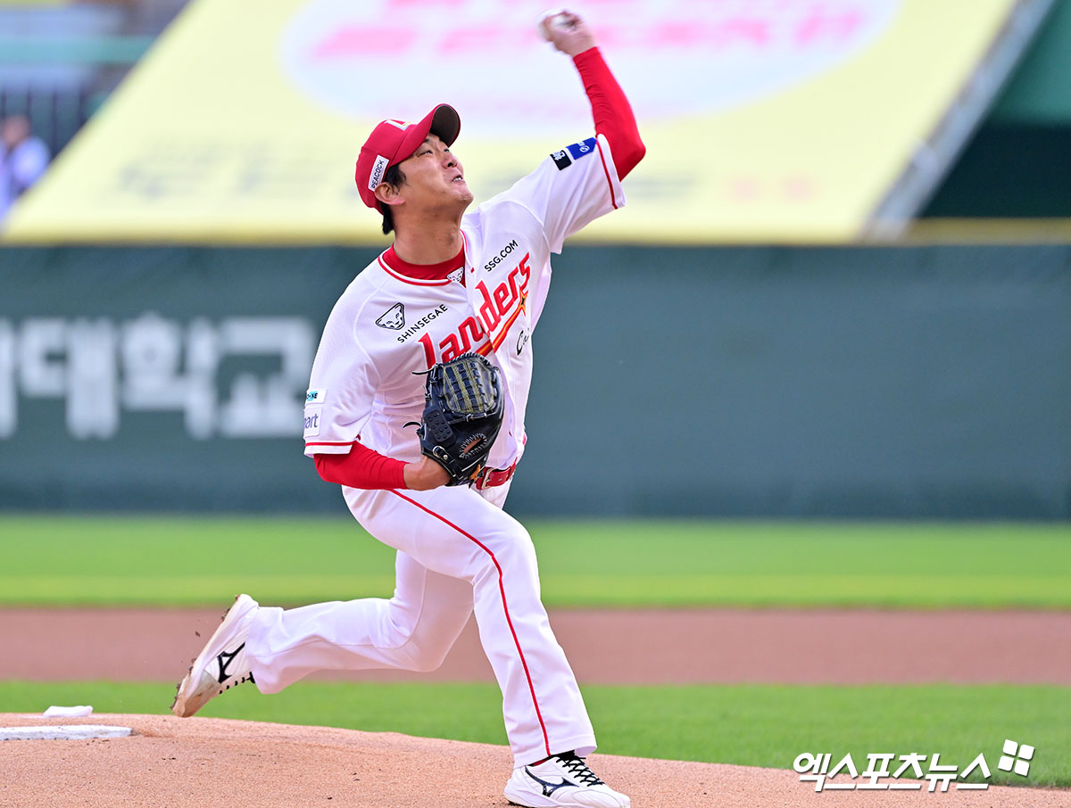 (엑스포츠뉴스 인천, 김한준 기자) 11일 오후 인천SSG랜더스필드에서 열린 '2025 신한 SOL Bank KBO리그' KIA 타이거즈와 SSG 랜더스의 더블헤더 2차전 경기, 1회초 SSG 선발투수 김광현이 공을 힘차게 던지고 있다.