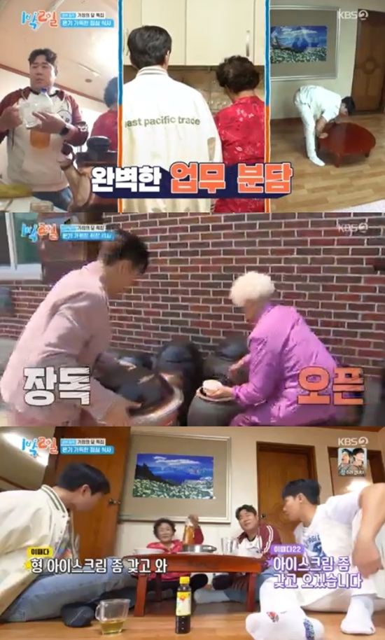 딘딘은 할머니 옆에서 요리 보조를 하며 달걀 프라이를 만들었고 이준은 상을 차렸다. 문세윤은 식기를 세팅했다.