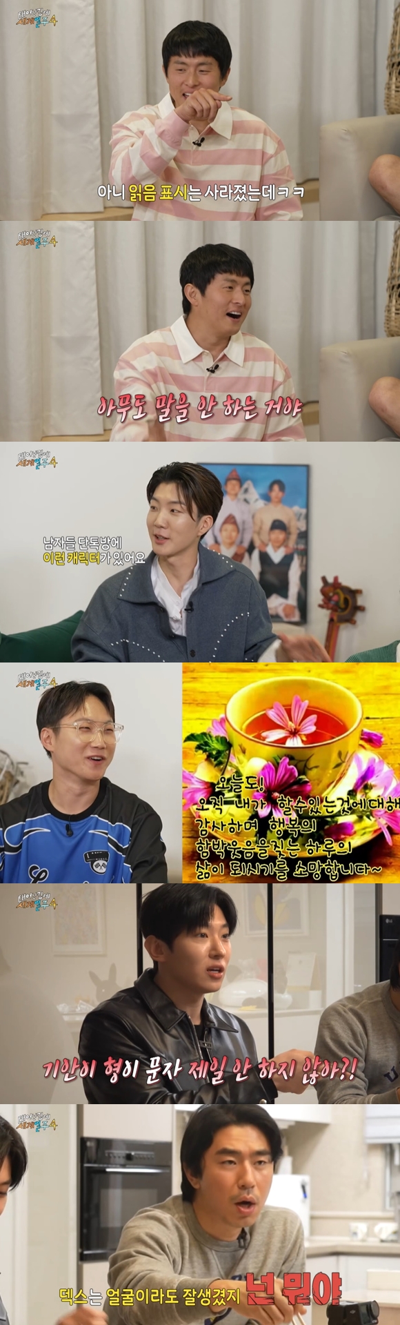 기안84는 "읽음 표시는 사라졌는데 아무도 말을 안 한다"라고 폭로했고, 이승훈은 "남자들 단톡방에는 이런 캐릭터가 있다. 혼자 고요 속의 외침을 하는. 좋은 글귀도 보내고"라고 전해 모두를 폭소케 했다.