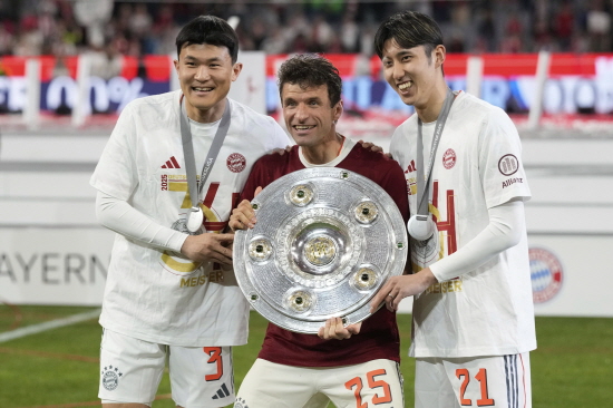 라이머 세리머니 뒤 다이어와 케인, 뮐러가 김민재를 앞으로 밀었다. 김민재는 우승 트로피를 한 차례 치켜들다가 마는 '페이크'까지 쓰면서 우승 기쁨을 만끽했다.