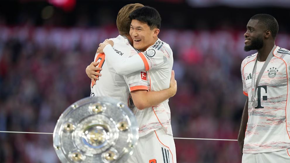 (엑스포츠뉴스 윤준석 기자) 2024-2025시즌 독일 분데스리가 우승팀 바이에른 뮌헨의 공식 세리머니 현장에서 김민재가 팀 동료들의 격려를 받으며 우승 트로피를 들어 올렸다.