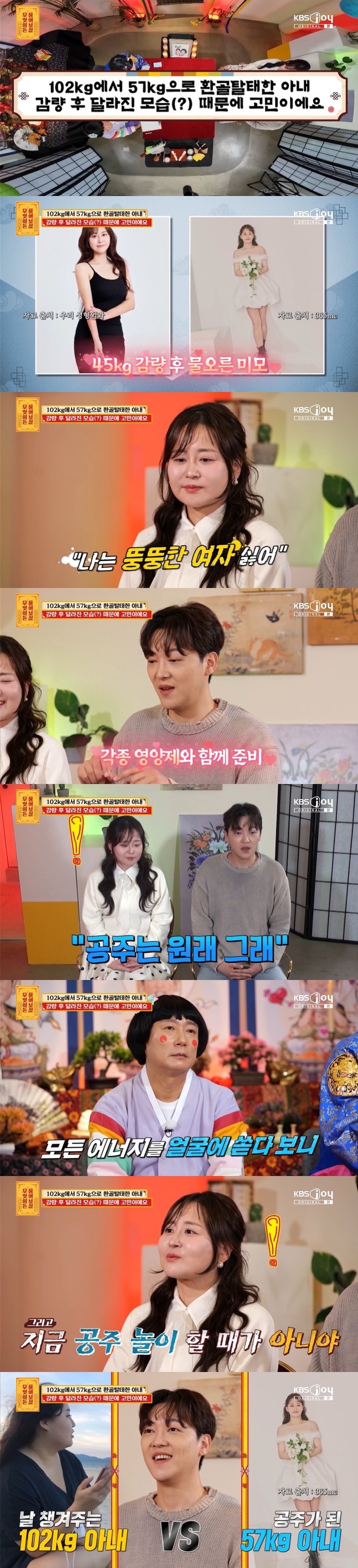 이날 사연자는 "아내가 원래 102kg였다", "현모양처처럼 잘 해줬는데 45kg을 빼고 나서 태도가 완전히 달라졌다"며 다이어트 성공 후 달라진 아내의 모습이 고민이라고 털어놨다.