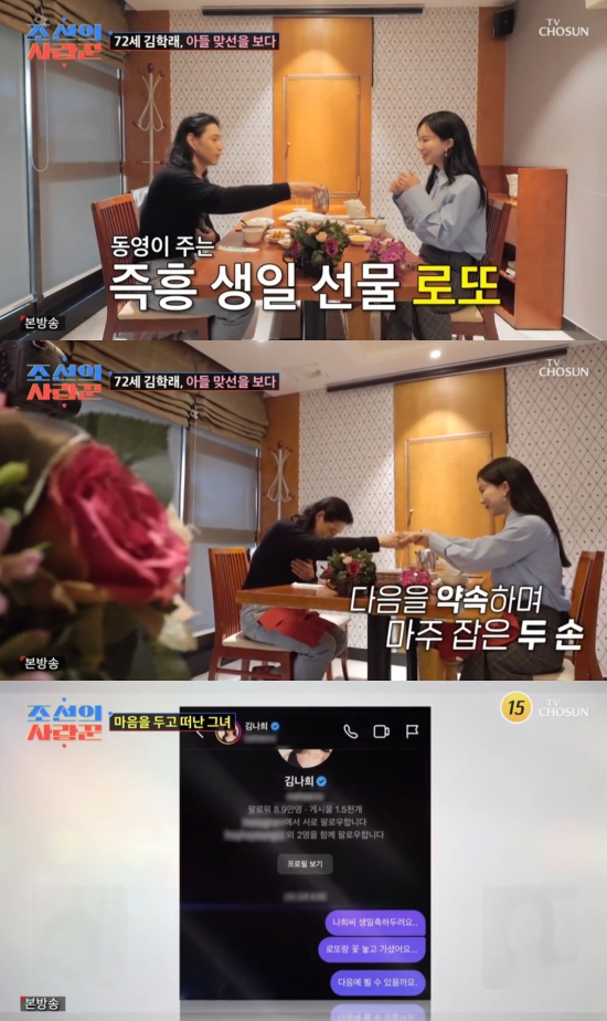 특히 임미숙은 김나희의 생일이라는 것을 알고 가게에 있는 난을 꺾어 즉석에서 꽃다발로 만들어 선물했다. 김동영 역시 "제가 선물 하나 드리겠다. 생일이니까. 제가 로또를 샀다"라며 복권을 건넸고, 김나희는 "제가 며칠 전에 꿈에서 로또 받는 꿈을 꿨다. 진짜 데자뷔다. 이렇게 접은 걸 받았다"라며 깜짝 놀랐다.