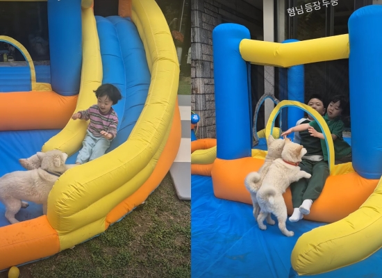 영상 속에는 대저택 앞마당에 설치한 대형 미끄럼틀을 타고 노는 두 아들의 모습이 담겨 있다. 강아지들과 장난을 치는 왕식, 강식 두 형제의 미소가 귀엽고 사랑스럽다.