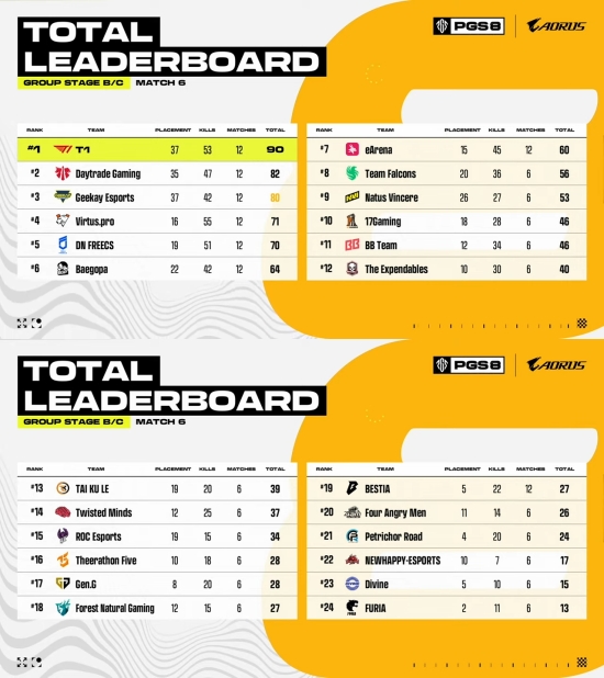 그룹 스테이지 B/C조 경기를 치른 결과, 오늘 2연속 치킨을 따낸 T1이 90점으로 전체 1위를 차지했다. 이로써 이들은 파이널 진출을 확정했으며, 3일 차 결과에 따라 전체 1위로 그룹스테이지를 마무리할 수 있게 됐다.