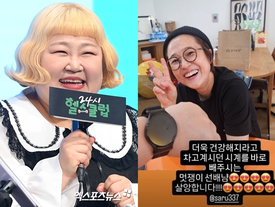 13일 홍윤화는 개인 계정에 "더욱 건강해지라고 차고 계시던 시계를 바로 빼주시는 멋쟁이 선배님. 사랑합니다!"라는 글과 함께 한 장의 사진을 올렸다.