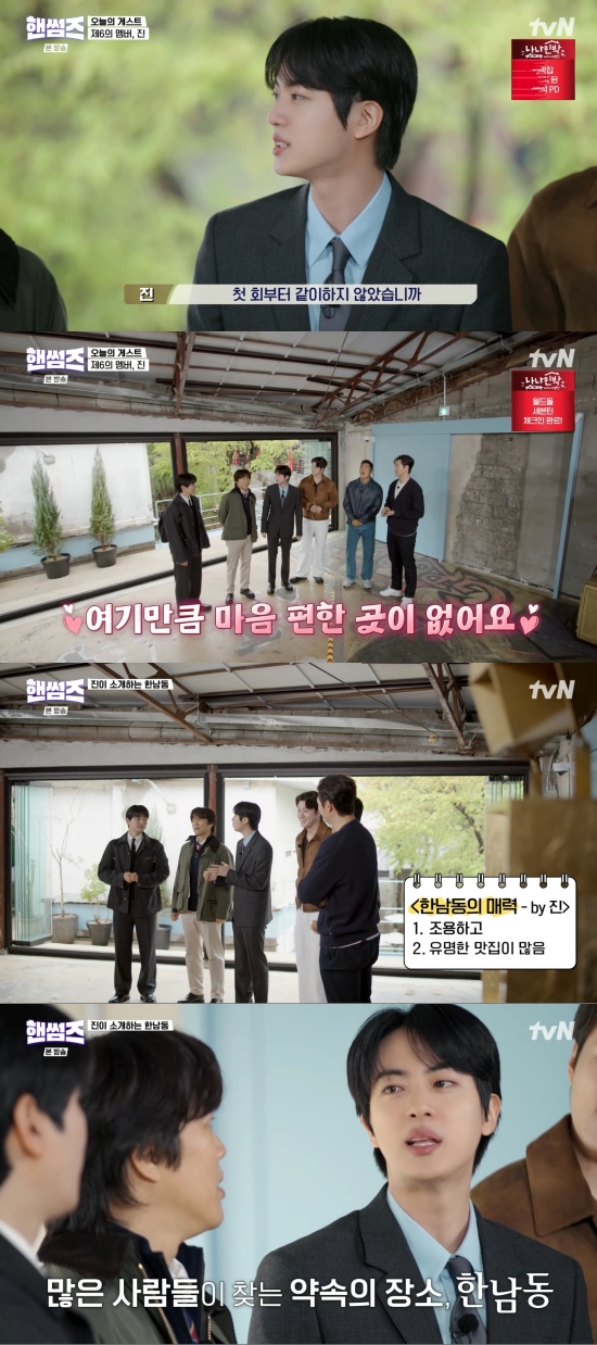 진은 "한남동의 매력이라고 하면 조용하다. 동네가 되게 조용하다. 그리고 맛집들이 유명한 곳들이 되게 많아서 사람들이 약속을 한남동으로 많이 잡는다"라며 자랑했다.
