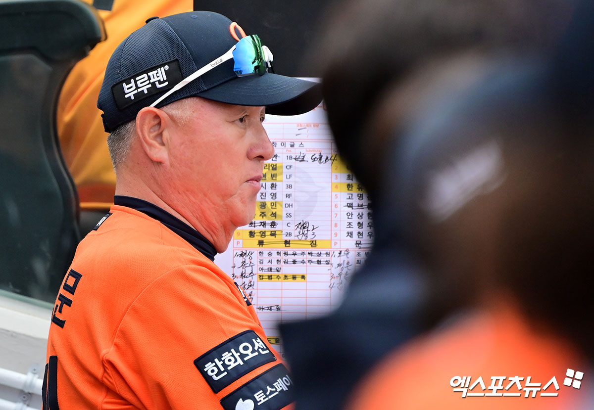 (엑스포츠뉴스 대전, 김한준 기자) 18일 오후 대전 한화생명 볼파크에서 열린 '2025 신한 SOL Bank KBO리그' SSG 랜더스와 한화 이글스의 경기, 한화 김경문 감독이 경기를 지켜보고 있다.
