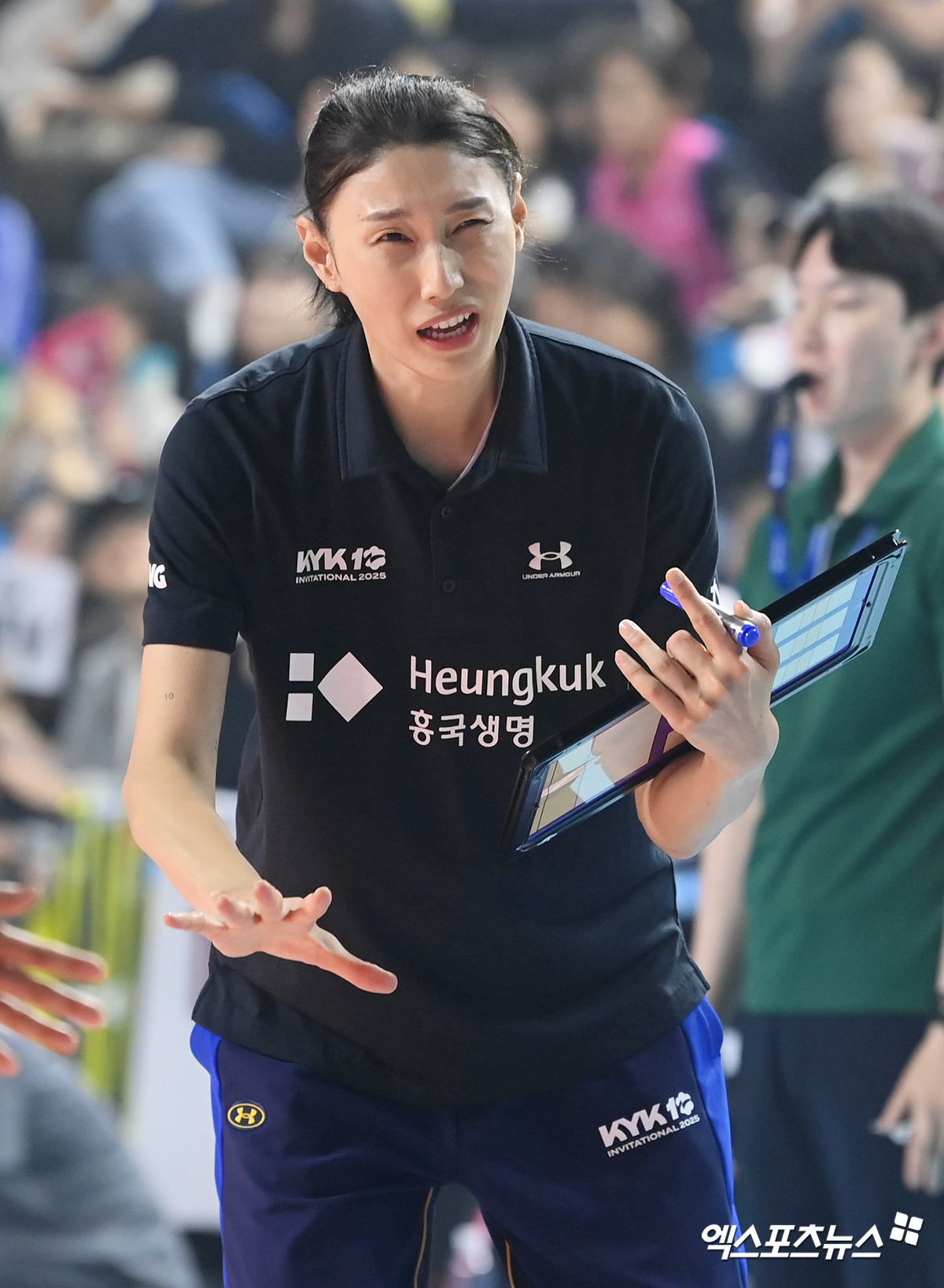 (엑스포츠뉴스 인천, 고아라 기자) 18일 오후 인천삼산월드체육관에서 열린 '제2회 김연경 인비테이셔널(KYK INVITATIONAL 2025)' 세계 올스타전, 팀 스타 김연경 감독이 작전을 지시하고 있다.