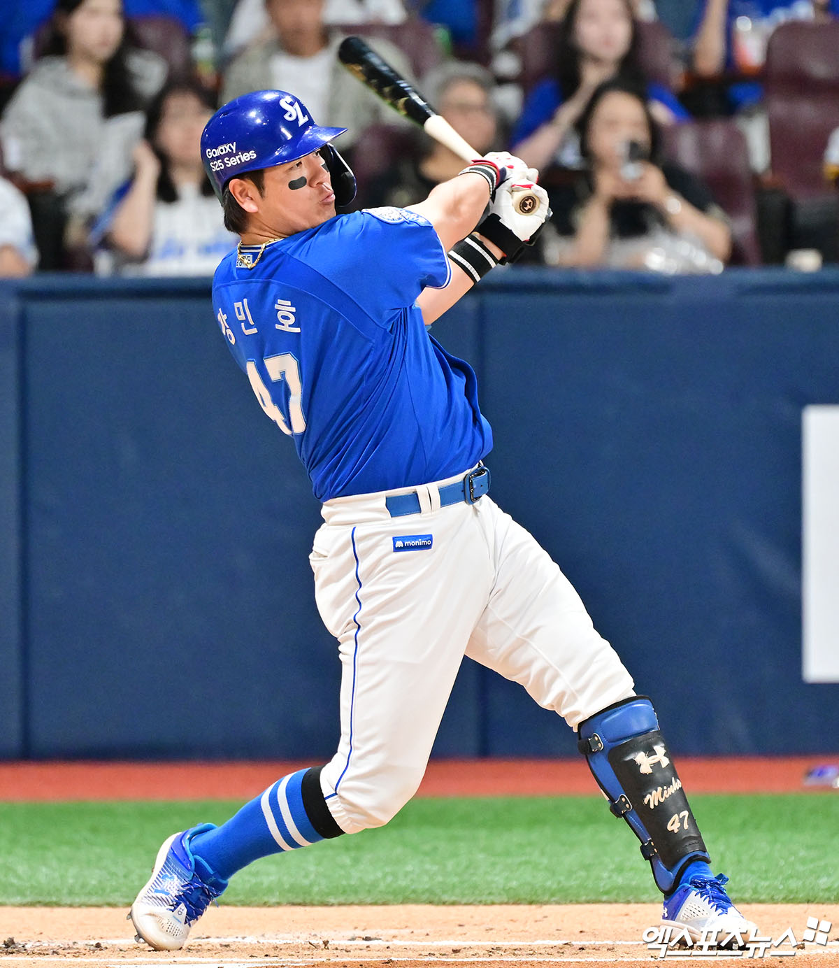 (엑스포츠뉴스 고척, 김한준 기자) 20일 오후 서울 구로구 고척스카이돔에서 열린 '2025 신한 SOL Bank KBO리그' 삼성 라이온즈와 키움 히어로즈의 경기, 2회초 1사 삼성 강민호가 중전안타를 날리고 있다.