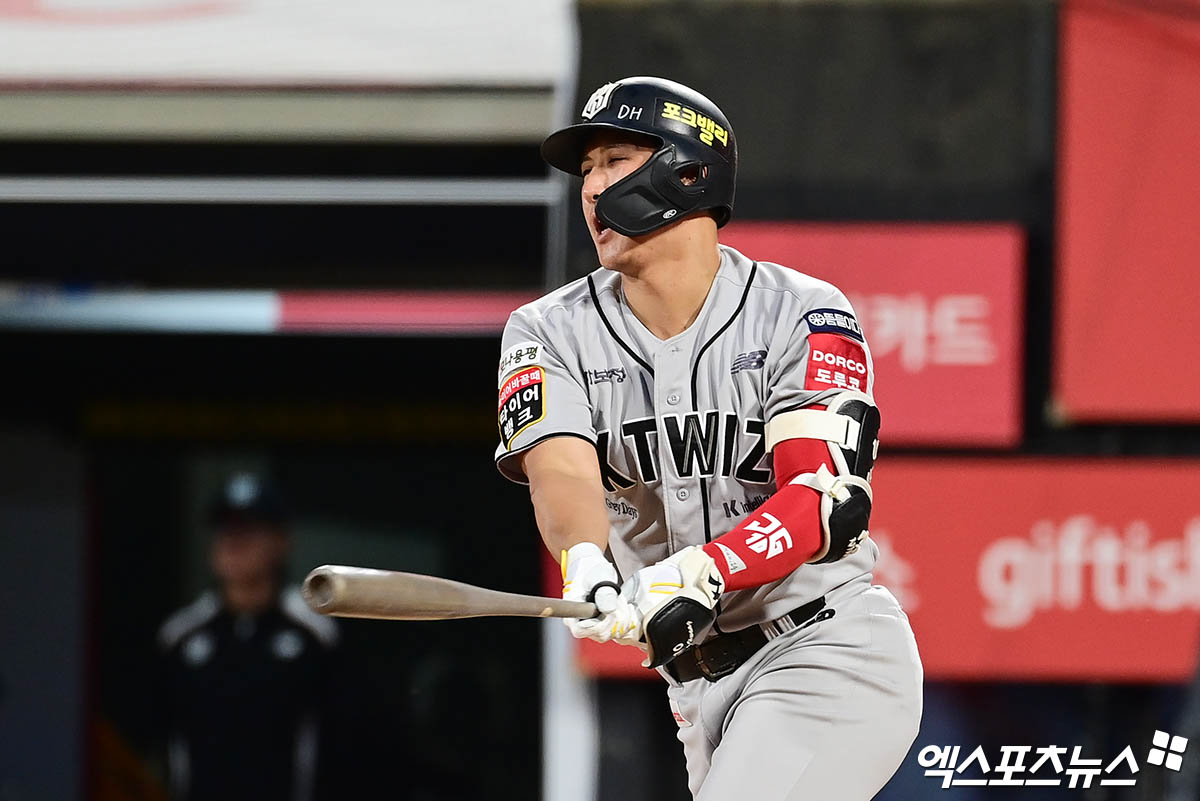 (엑스포츠뉴스 수원, 박지영 기자) 20일 오후 경기도 수원케이티위즈파크에서 열린 '2025 신한 SOL Bank KBO리그' KIA 타이거즈와 KT 위즈의 경기, 5회말 KT 선두타자 황재균이 안타를 때려내고 있다.
