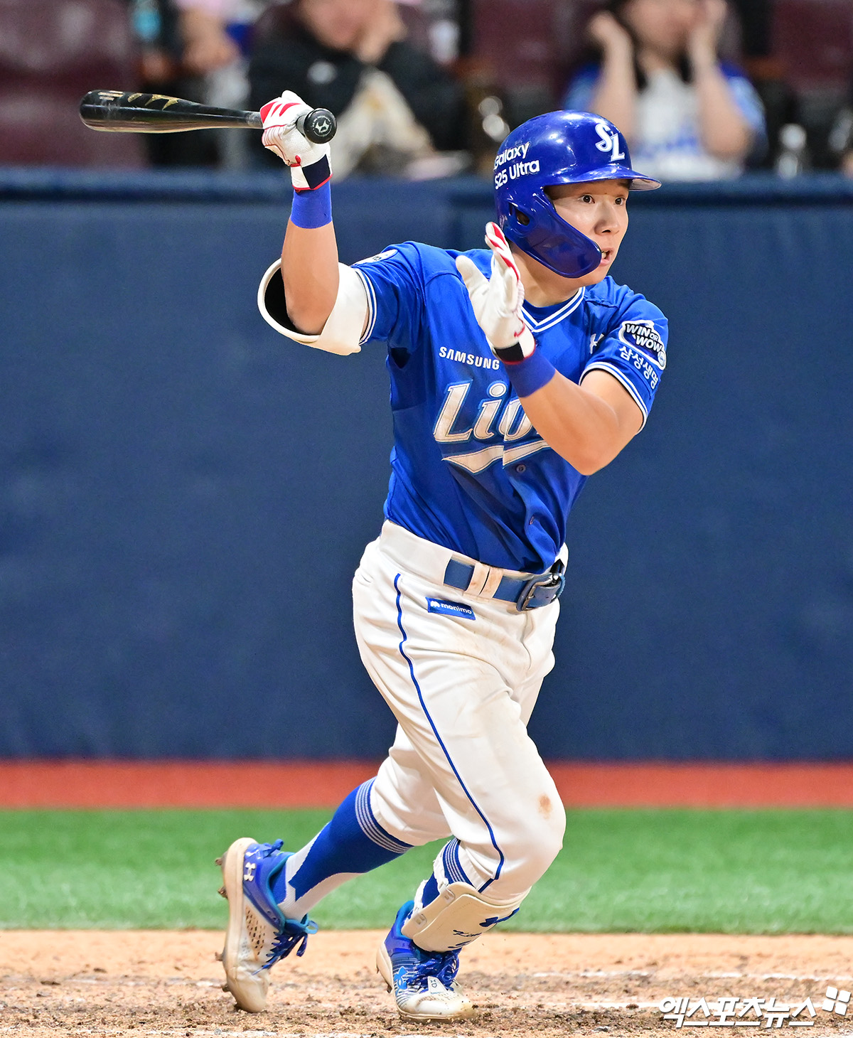 (엑스포츠뉴스 고척, 김한준 기자) 20일 오후 서울 구로구 고척스카이돔에서 열린 '2025 신한 SOL Bank KBO리그' 삼성 라이온즈와 키움 히어로즈의 경기, 11회초 1사 만루 삼성 김지찬이 1타점 적시타를 날리고 있다.