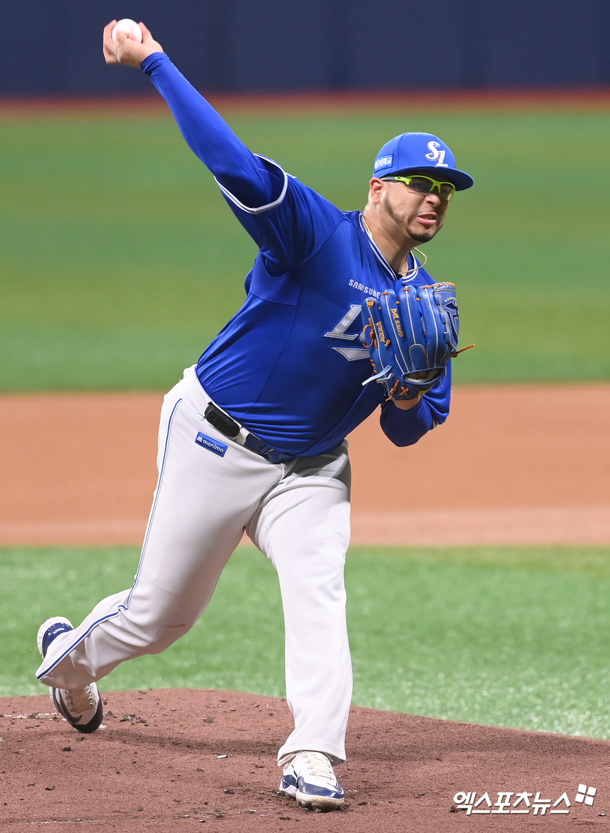 (엑스포츠뉴스 고척, 고아라 기자) 21일 오후 서울 구로구 고척스카이돔에서 열린 '2025 신한 SOL Bank KBO리그' 삼성 라이온즈와 키움 히어로즈의 경기, 1회말 삼성 선발투수 후라도가 공을 힘차게 던지고 있다.