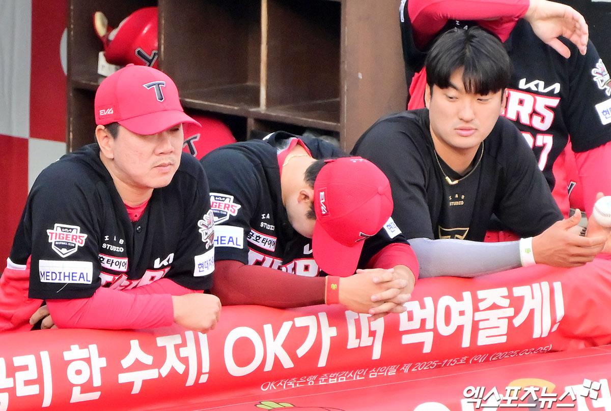 (엑스포츠뉴스 수원, 김한준 기자) 21일 오후 수원KT위즈파크에서 열린 '2025 신한 SOL Bank KBO리그' KIA 타이거즈와 KT 위즈의 경기, 1회말 1사 1,3루 KT 장성우의 플라이 타구때 포구 실책을 한 KIA 최원준이 교체된 후 아쉬워하고 있다.