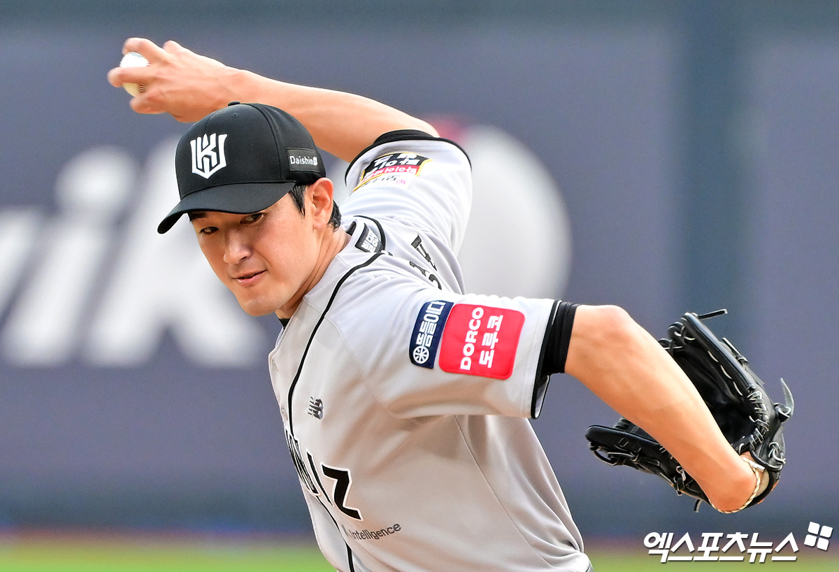 (엑스포츠뉴스 수원, 김한준 기자) 21일 오후 수원KT위즈파크에서 열린 '2025 신한 SOL Bank KBO리그' KIA 타이거즈와 KT 위즈의 경기, 1회초 KT 선발투수 고영표가 공을 힘차게 던지고 있다.